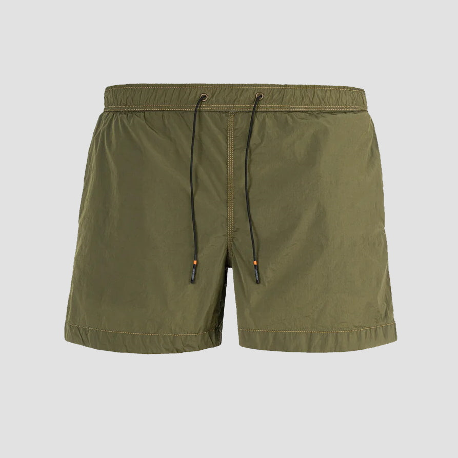 These beach shorts are distinctive for their extreme lightweight quality and the extensive range of appealing colors of the sought-after crinkle-effect, quick-drying stretch fabric. The semi-iridescent effect adds a subtle touch of originality to this ongoing style from the collection, which features an adjustable drawstring waistband with piping and contrasting orange finials. The shorts feature side French pockets and a back pocket that is closed by an invisible zipper. The black micro-injected logo adds the finishing touch to this beach life hero.